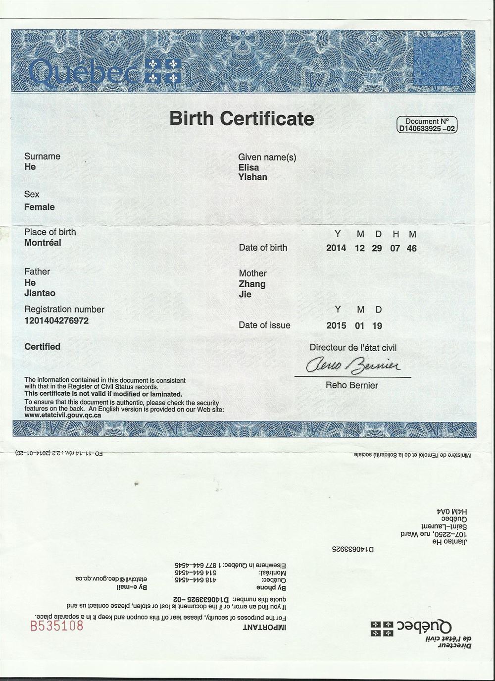 加拿大-魁北克-出生證明翻譯 模版 咸陽市翻譯公司 隨到隨譯 方便快捷 咸陽各類證件翻譯